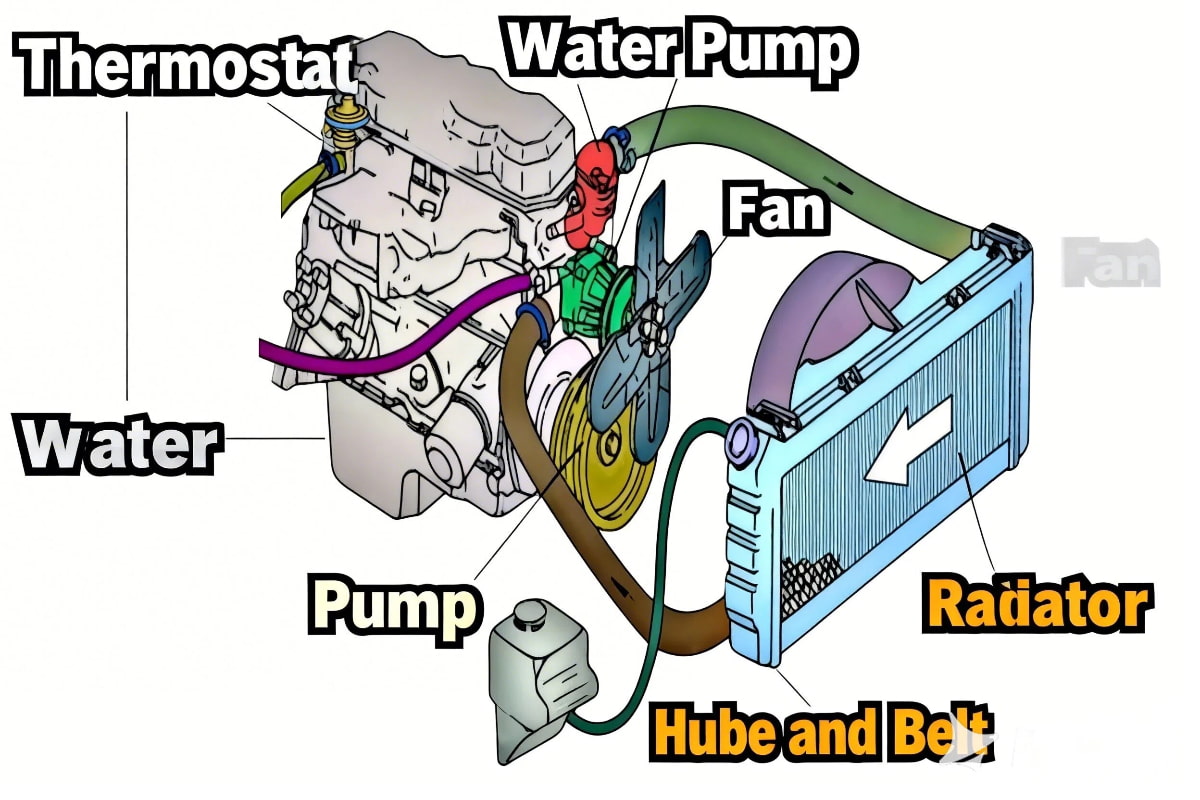 (1) مكونات نظام التبريد: يتحكم منظم الحرارة في مسار دوران سائل التبريد (حلقة صغيرة للتسخين السريع، وحلقة كبيرة لتبديد الحرارة المحسن)؛ وتضمن مضخة الماء والمبرد والمروحة كفاءة تدفق سائل التبريد وقدرة تبديد الحرارة.